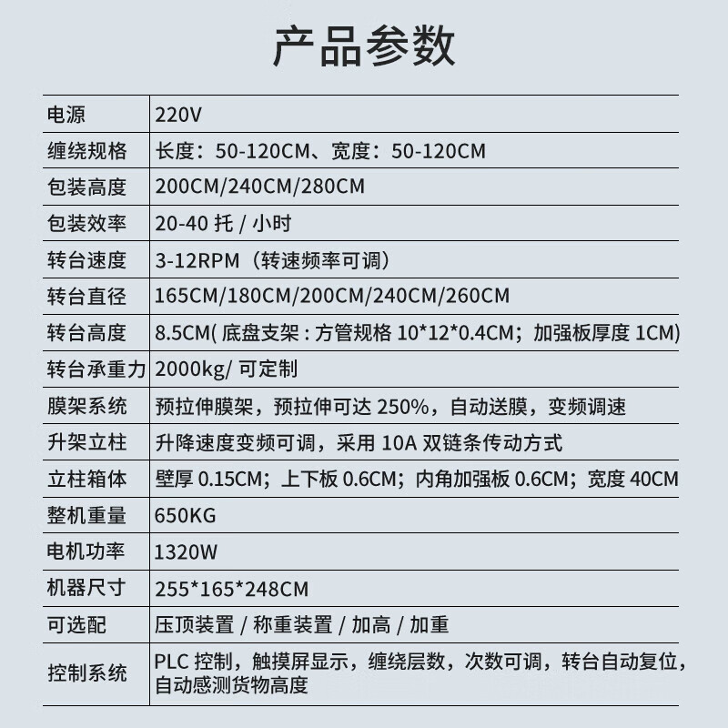 智能全自動纏繞機,2噸超大承重,加厚大托盤堅固更耐用,強勁動力高效銅芯電機,數(shù)控顯示屏方便調(diào)節(jié)操作簡單。